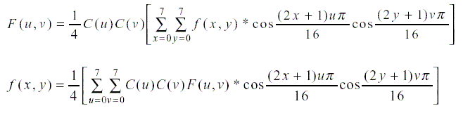 gde je C(u)=C(v)=1/sqrt(2) za u,v=0 i C(u)=C(v)=1 u suprotnom. Jednačina inverzne DCT (IDCT, f(x,y)) daje vrednosti signala u funkciji prostornih koordinata x i y, ako su poznati koeficijenti njegove diskretne kosinusne transformacije.